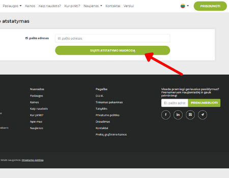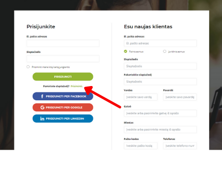 - Grįžkite į prisijungimo puslapį ir suveskite el.pašto adresą bei naują slaptažodį