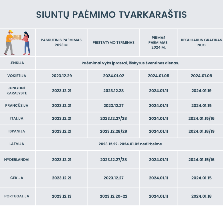 Gražiausios metų šventės jau visai čia pat, tad, kad jų laukimas būtų be rūpesčių ir užsakytos siuntos pasiektų Jus laiku, skubame dalintis siuntų paėmimo ir pristatymo tvarkaraščiu.