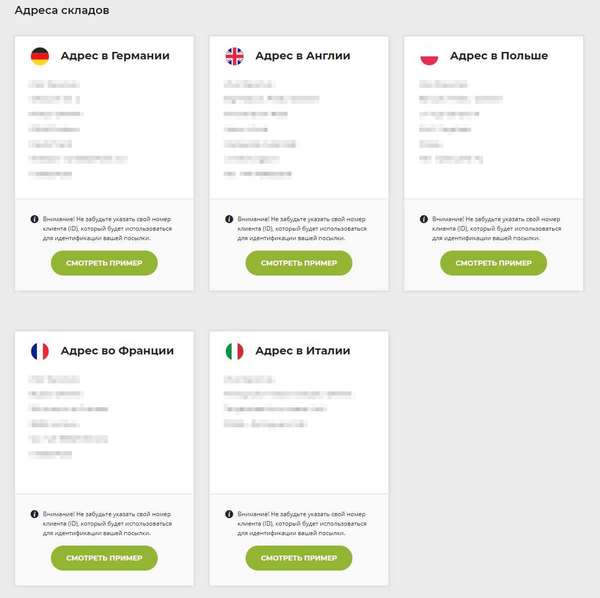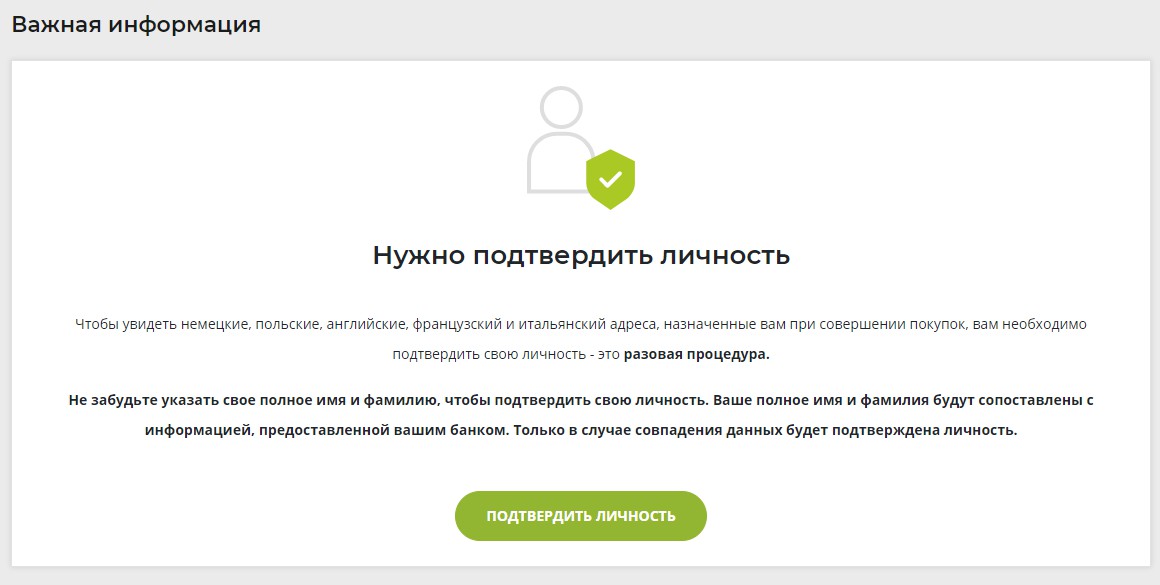 После того, как вы подтвердите свою личность, вы увидите адреса Германии, Испании, Англии, Польши, Франции, Италии, Нидерландов и других странах, которые появляются и назначаются вам в правом углу окна вашей учетной записи. После выбора желаемой покупки укажите следующие адреса складов в Германии, Испании, Англии, Польше, Франции, Италии, Нидерландах и других странах. Европы. Очень важно указывать адресные данные точно так, как мы даем вам, особенно имя и фамилию лица, получающего посылку, и номер клиента (ID), который является уникальным номером вашего аккаунта, под которым мы будем идентифицировать вашу посылку и назначать ее вашему аккаунту. Вы будете уведомлены об етом по электронной почте. После прибытии вашей покупки она будет отправлена в Эстонию и доставлена вам одним из выбранных вами способов доставки.