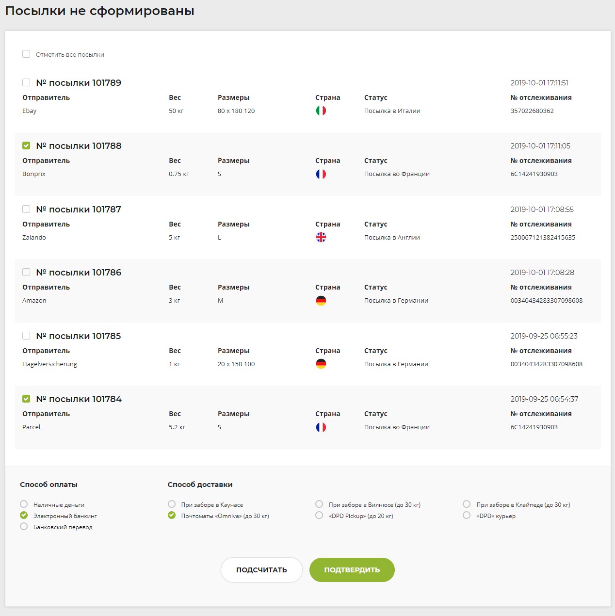 Вы должны выбрать один из следующих способов доставки посылок: почтомат «Omniva», «SmartPosti», «SmartPosti» или «Omiva» курьерская служба.